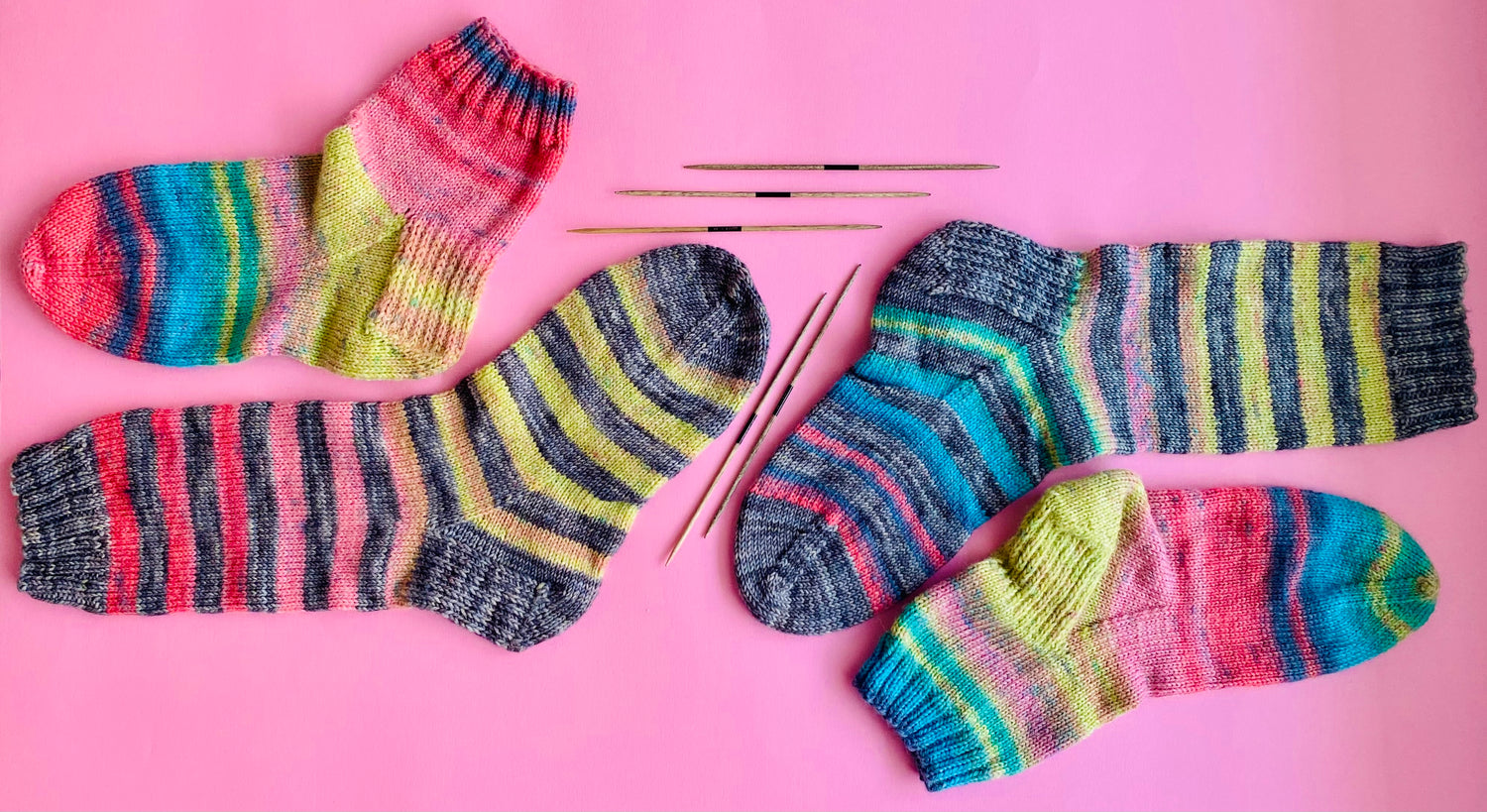 Laine à bas : Pour des bas, on vous conseille un fil qui contient un peu de nylon en plus de la laine pour qu’ils soient plus solides. On parle souvent de fil de type « fingering » ou « sport ». On a plein d’options en boutique, alors n’hésitez pas à demander conseil! En général, vous aurez besoin de moins de 100 grammes pour tricoter une paire de bas moyens. Une balle ou écheveau de laine suffit donc normalement à tricoter une paire de bas! (Pour info, les 2 paires de bas sur l'image ci-dessus ont été tricotées avec la même balle de laine dégradée, et il en restait même une toute petite boulette à la fin. Les bas rayés ont été faits en alternant cette laine dégradée + la laine unie grise)